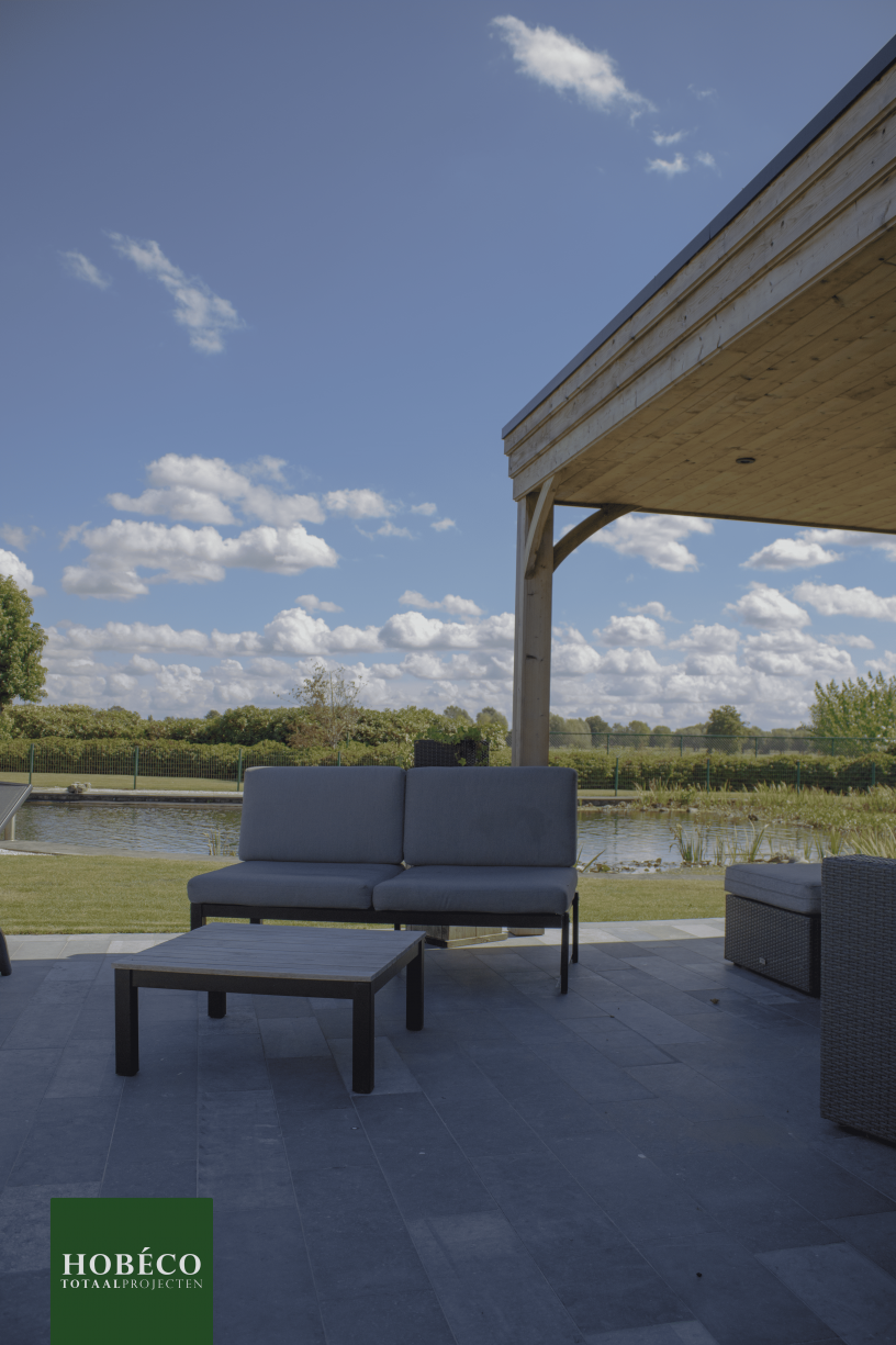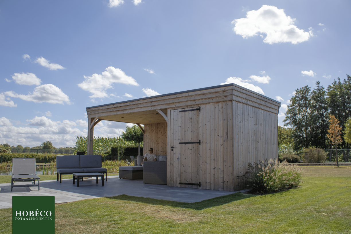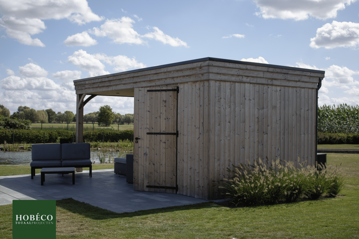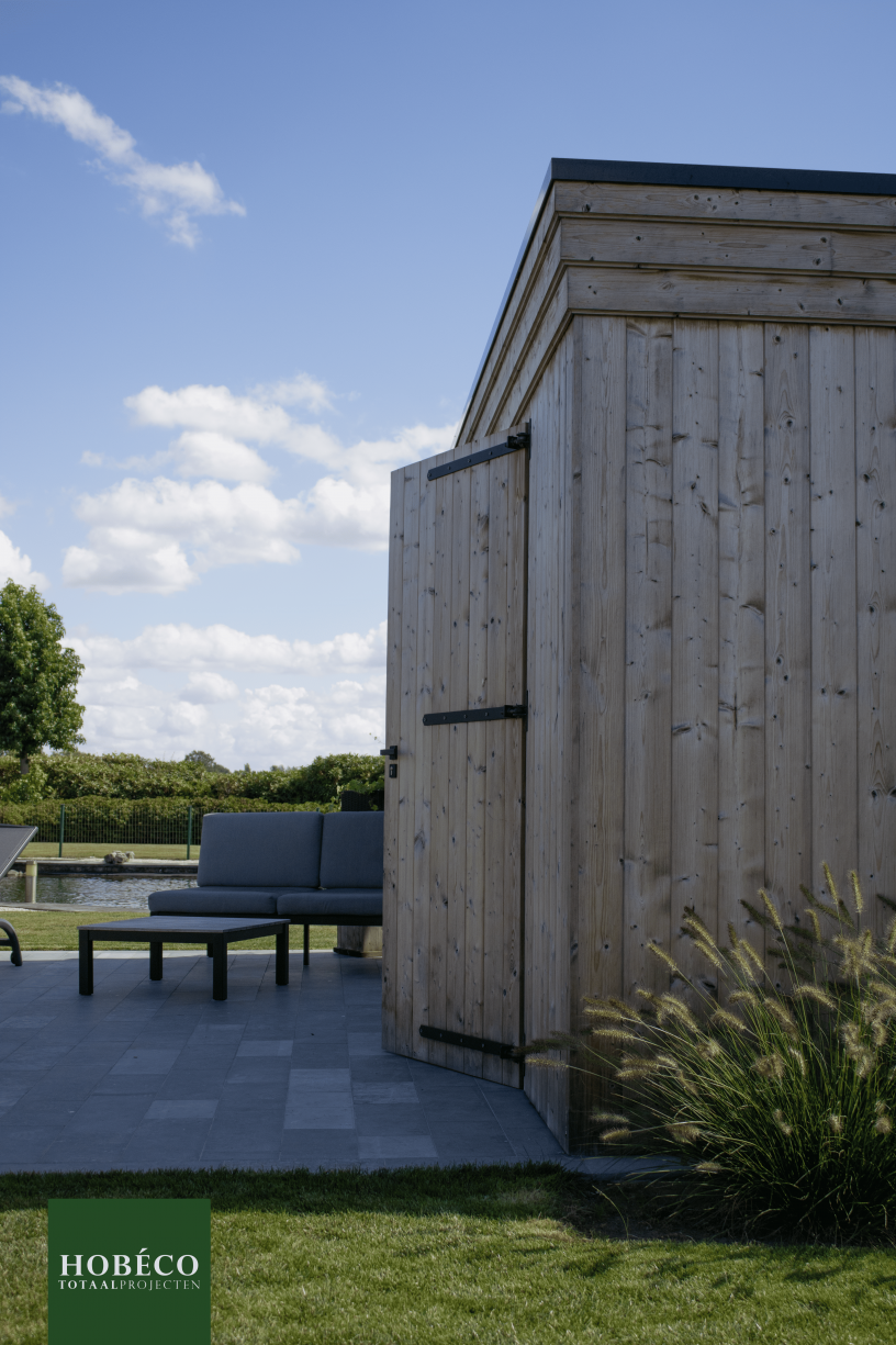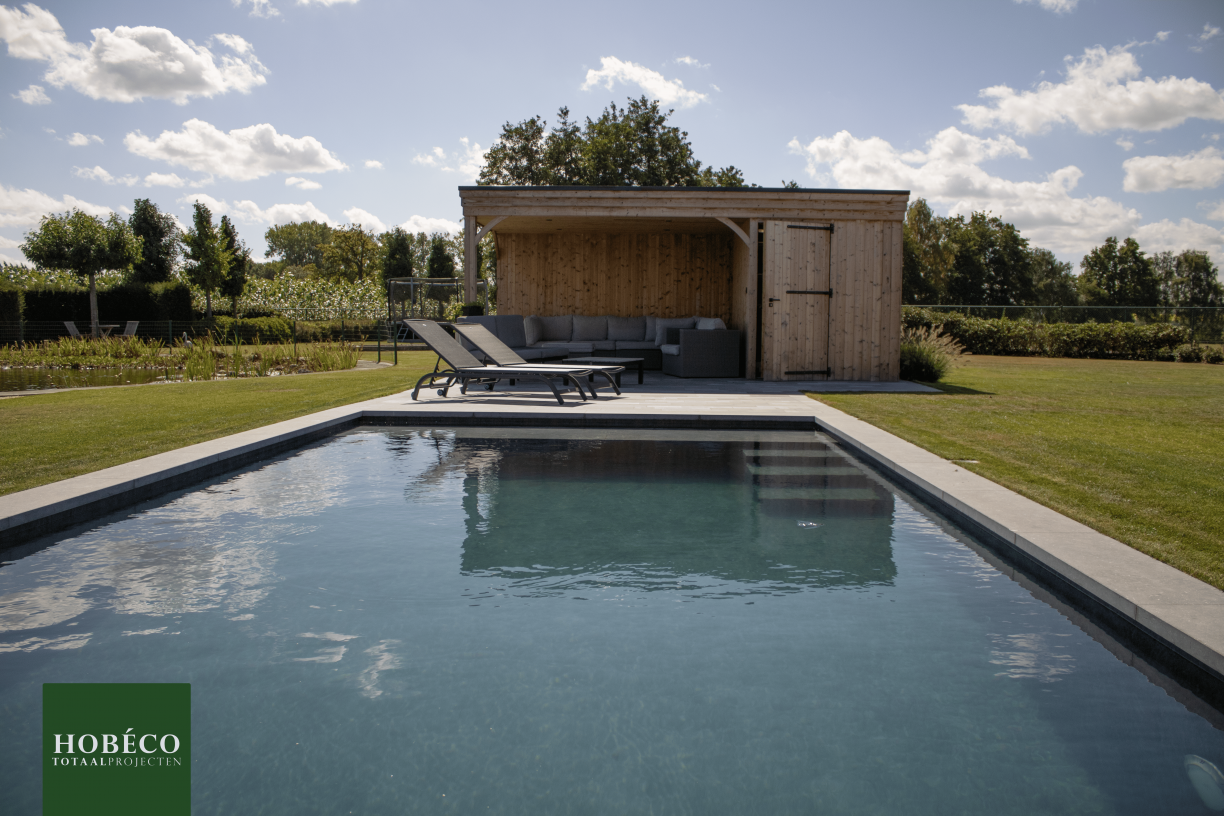Poolhouse in thermo vuren met een kroonlijst. Zwembad is afgewerkt met een boordsteen in Belgische arduin.